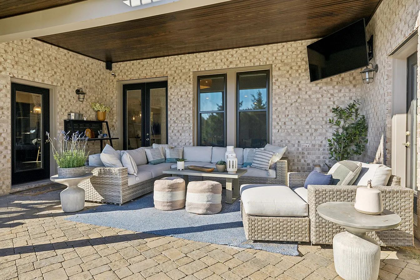 The foyer tells you two things at once. The high ceilings tell you the house has scale. The custom millwork tells you someone cared about every inch of it. Dual staircases rise on either side, framing the entry in the kind of architectural symmetry that Tudor design does better than any other style, formal without being cold, traditional without being dated, and finished with the kind of thoughtfully designed details that announce, before you've crossed the threshold, that 9613 Portofino Drive is a house where craftsmanship and comfort operate on the same level. The newly remodeled kitchen confirms it. A large center island anchors the room beneath custom coffered ceilings that elevate the space from functional to architectural. Chef's appliances line the counters. The open floor plan connects kitchen, living, and dining in a flow of natural light that makes the 6,871 square feet feel seamless rather than segmented. Custom millwork appears at every turn—doorways, built-ins, bookcases, trim, the quiet infrastructure of a home designed by people who understood that luxury lives in the details. Five bedrooms, five bathrooms, walk-in closets throughout, and the kind of high ceilings that make even the secondary rooms feel generous. Upstairs, three bedrooms with walk-in closets share access to a large recreation room, an ideal family gathering space, a playroom, a media lounge, or whatever the household needs it to be. The finished basement delivers the estate's entertainment depth. A second recreation area with its own fireplace. A dedicated movie room. A gym. An ensuite bedroom with a well-appointed kitchenette, a self-contained guest suite perfect for extended stays or in-law living. A wet bar completes the lower level. Outside, the property backs to a large HOA-maintained green space—open, managed, available for homeowners to enjoy—that extends the estate's footprint into the kind of mature, natural setting that most Brentwood subdivisions can only promise. You sit on the back terrace after dark, the green space quiet beyond the lot line, the coffered kitchen glowing through the windows, and Tuscany Hills doing what it's done since the first home was built here: offering one of the most prestigious, most convenient, and most quietly elegant residential addresses in Brentwood, minutes from shopping, dining, and the top schools in Williamson County, and a world away from everything else.