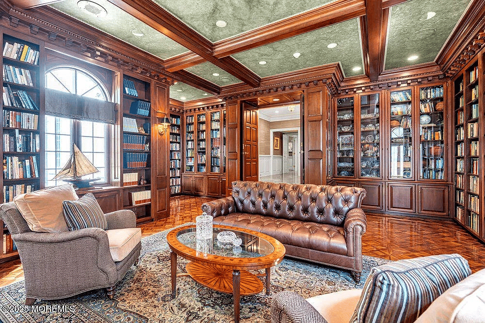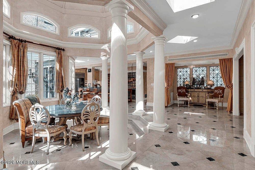 Nearly 12,000 square feet of European-inspired architecture on 10.1 gated acres in Toms River, New Jersey—with a private guard house, an Italian fountain, a paneled library, a temperature-controlled wine cellar, a primary suite with dry sauna, a clover-leaf pool, and a full-size sport court.