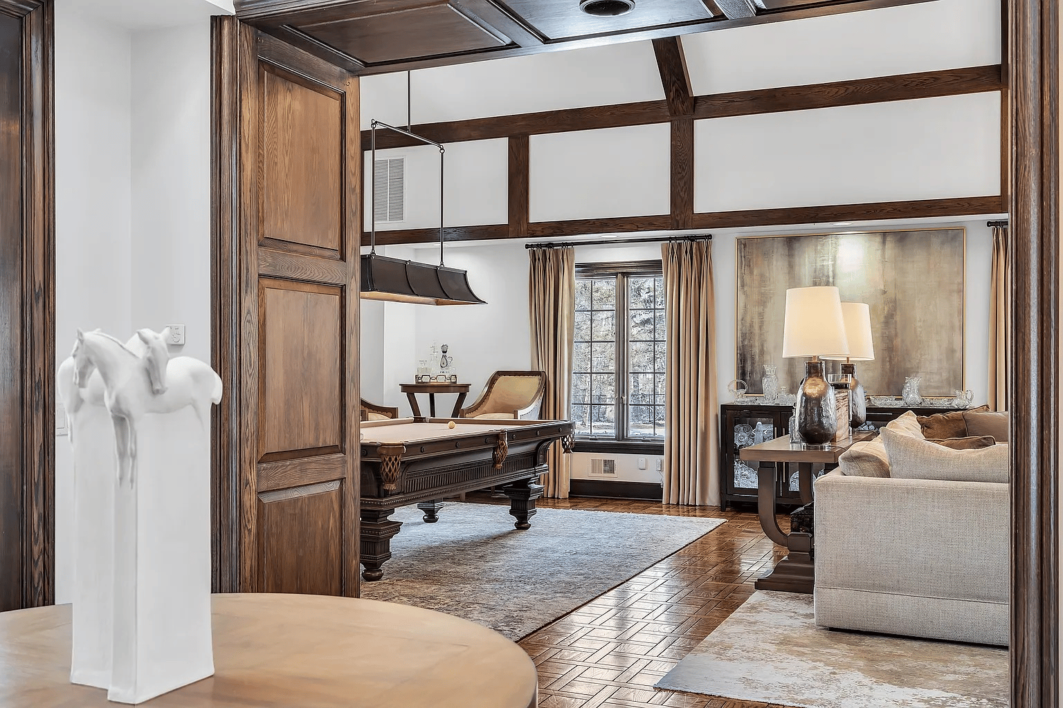 Wine Cellar, Paneled Library & Movie Theater – A temperature-controlled wine cellar for hosting and tasting, a richly paneled library for quiet hours, and a private movie theater anchor the interior amenity suite, complemented by a finished lower-level lounge with room for future expansion.